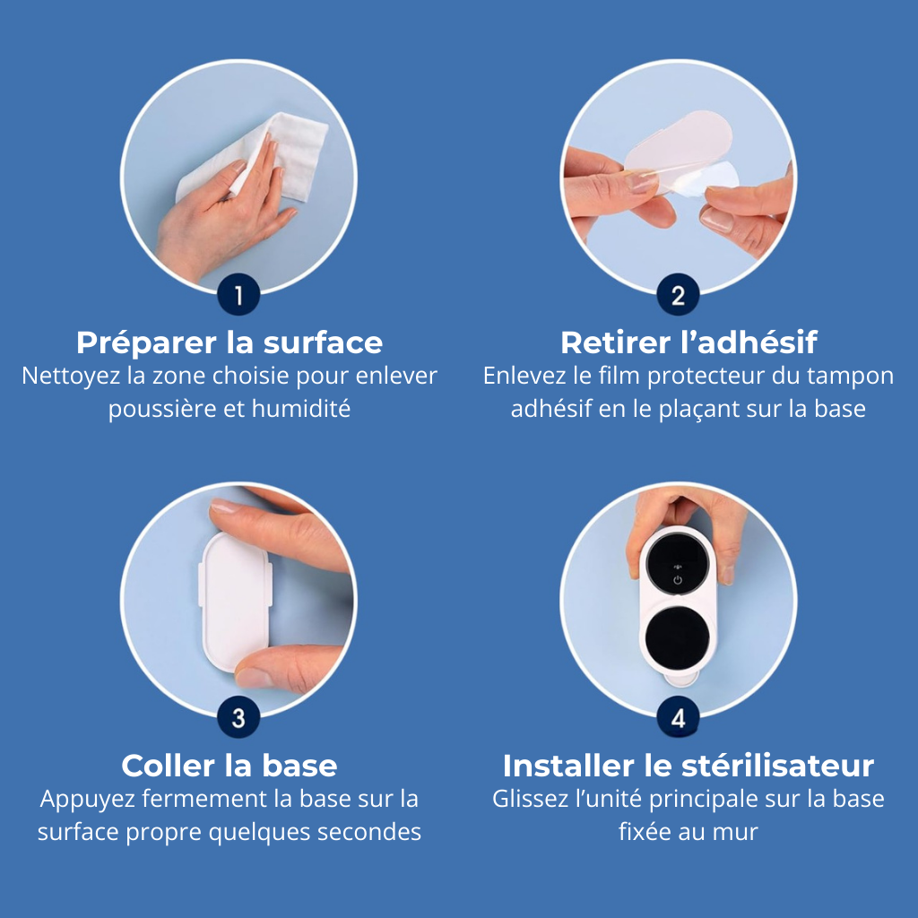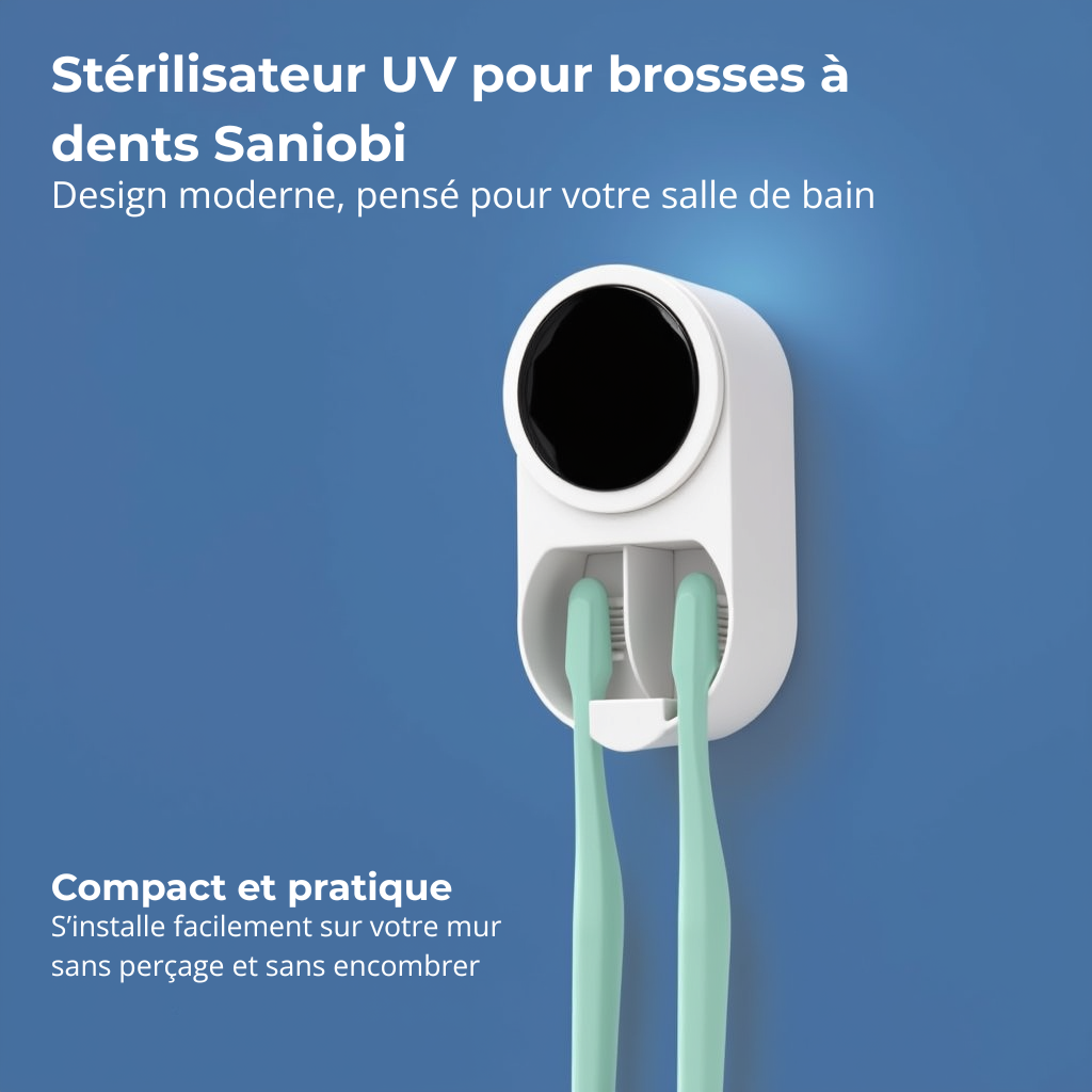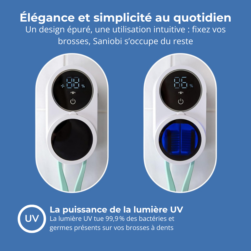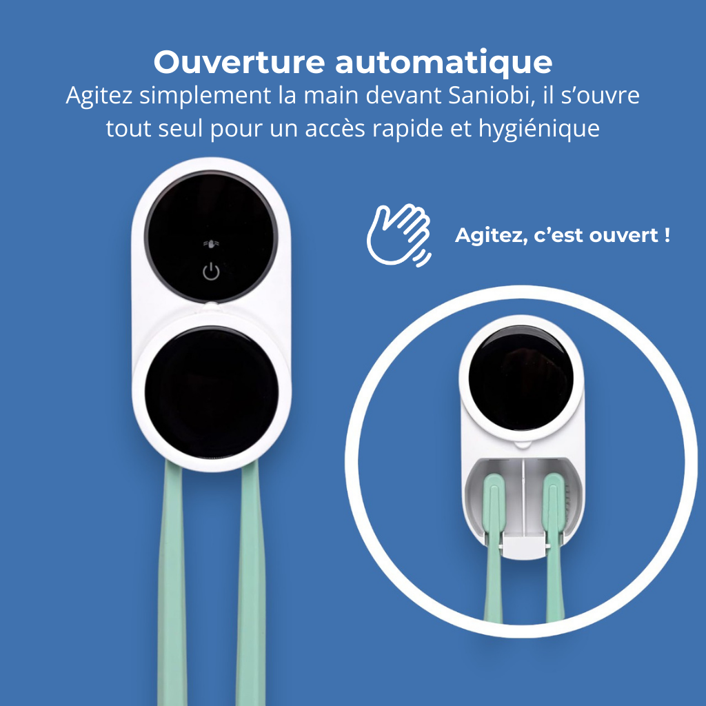 Fini les brosses sales, les bactéries et les mauvaises odeurs. Fixé au mur, élégant et discret, Saniobi s’intègre parfaitement à votre salle de bain. Pas de perçage, pas de bouton compliqué : il fonctionne automatiquement pour stériliser vos brosses à dents pendant que vous vous préparez.